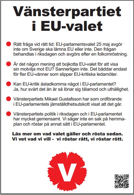 För egen del är det en klen tröst att andelen röster för Vänsterpartiets lista med 8.0% placerar oss i Vänersborg efter Göteborg med 8.6% och Lilla Edet med 8.2% på tredje plats bland Västra Götalands 49 kommuner. Visserligen är också resultatet i hela riket en förbättring om vi jämför med 2009. Ändå känns det bittert att veta att Mikael Gustafsson inte längre har en plats i parlamentet. Vi som har följt honom och hans arbete i Europarlamentet vet om många starka och positiva insatser han lyckades göra. Malin Björk bär nu med sig våra förväntningar och vårt hopp att vår röst fortsätter att betyda något på plats i Bryssel och i Strasbourg.